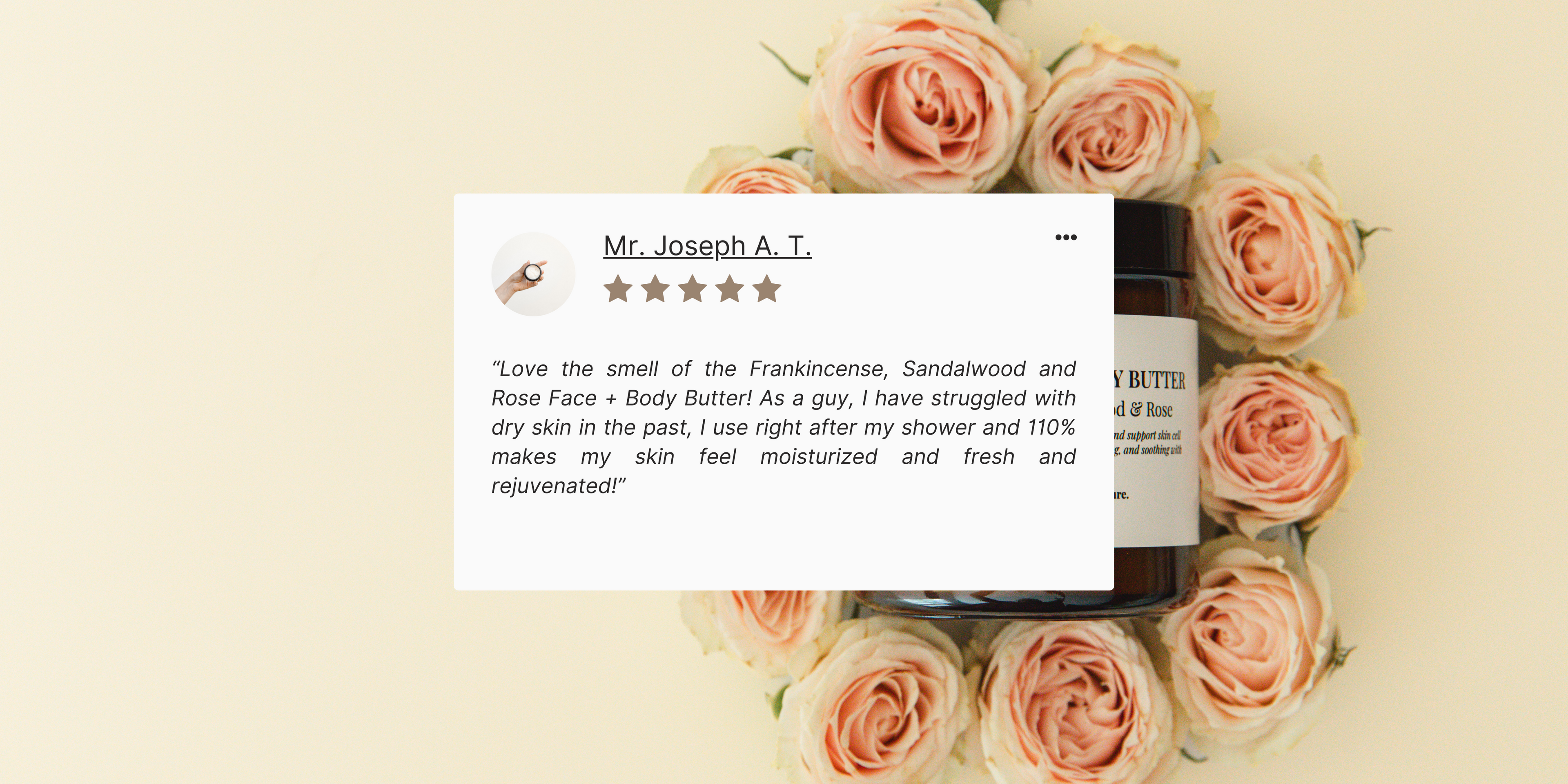 Love the smell of the Frankincense, Sandalwood and Rose Face + Body Butter! As a guy, I have struggled with dry skin in the past, I use right after my shower and 110% makes my skin feel moisturized and fresh and rejuvenated! Plus, my tattoo on my right arm looks fresh after a coat of the body butter! Pick up multiple packs because this body butter will make you look like $1,000,000.00 bucks!