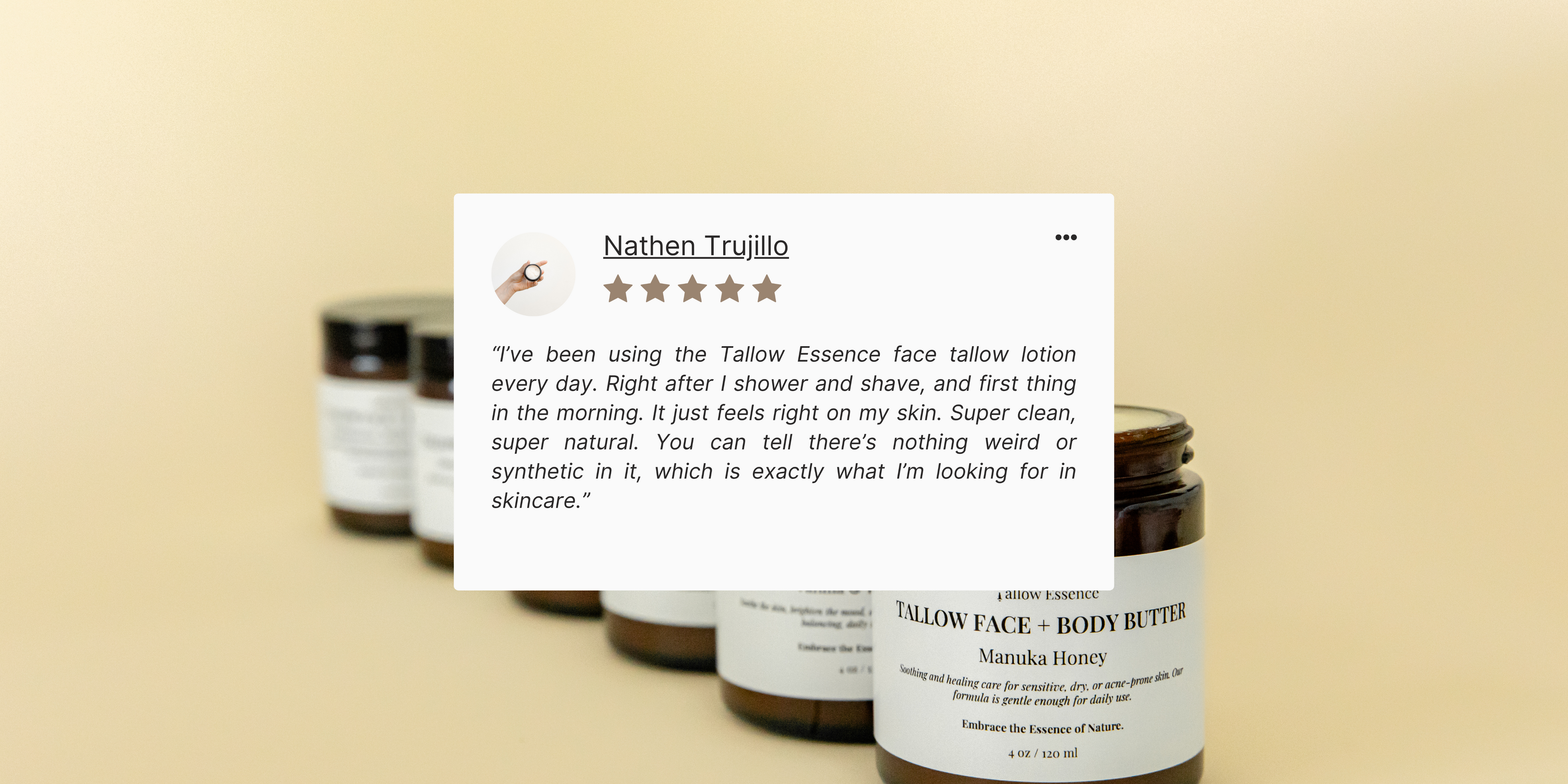 I’ve been using the Tallow Essence face tallow lotion every day. Right after I shower and shave, and first thing in the morning. It just feels right on my skin. Super clean, super natural. You can tell there’s nothing weird or synthetic in it, which is exactly what I’m looking for in skincare.