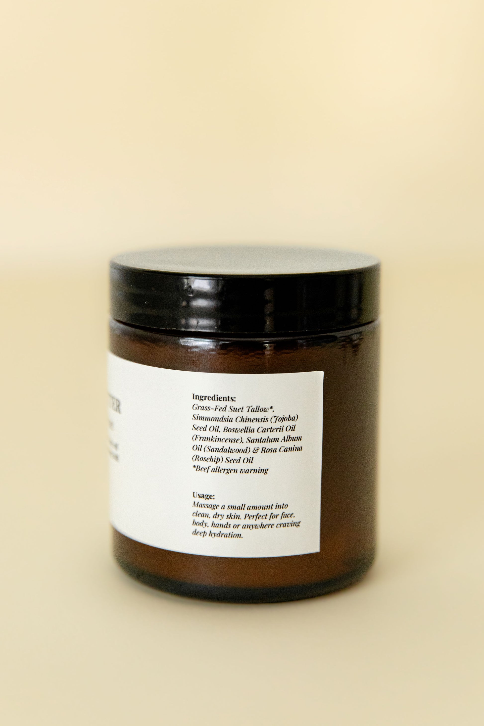 A luxurious, whipped tallow butter infused with frankincense, sandalwood, and rose to deeply nourish, soften fine lines, and restore skin’s natural elasticity. Crafted with ancestral, non-toxic ingredients safe for all skin types.
